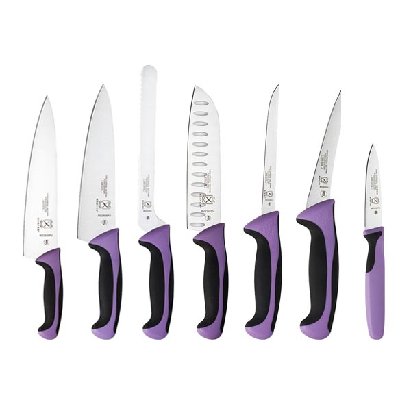 - (7) Knives: 10" chef's, 8" chef's, 8" offset bread, 7" santoku, 6" narrow boning, 6" curved boning, 3" slim paring