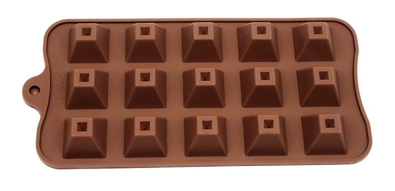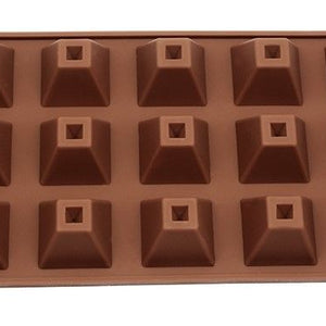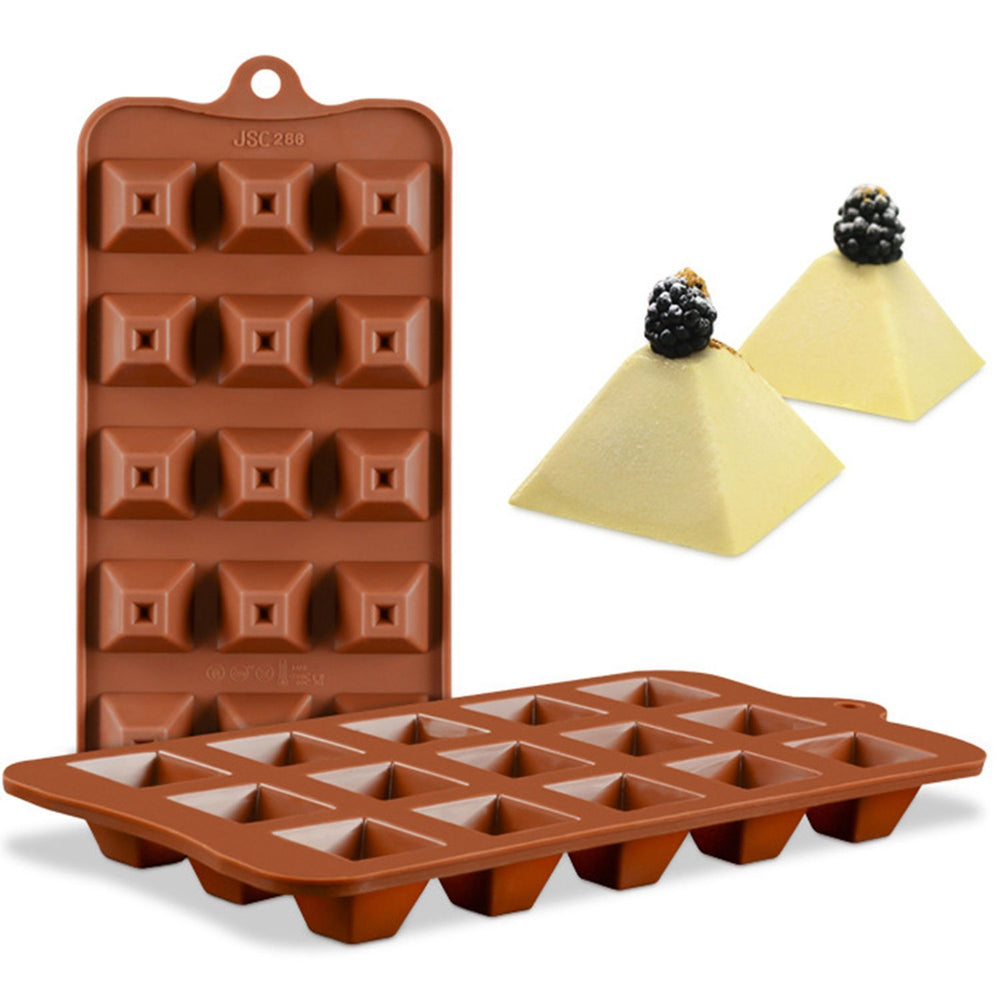 A pyramid-shaped silicone mold for making chocolates and candies is a flexible, non-stick mold designed to create treats in a unique geometric shape. These molds are typically made of food-grade silicone, making them safe for use with food and easy to release the chocolate or candy. They are also heat-resistant, allowing for use in the oven, microwave, and freezer, and can be easily cleaned in the dishwasher.