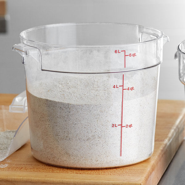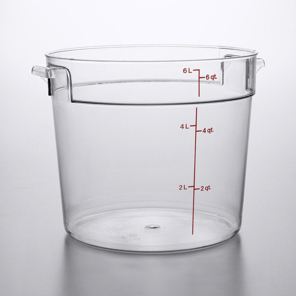 - Exceedingly versatile in both size and design, this food storage container is perfect for portioning and storing all your ingredients, toppings, and pre-prepared foods. Exceptional clarity allows you to quickly recognize and assess contents, while the ample 6 qt. capacity provides users with endless storage possibilities! Equipping the container with a compatible lid (sold separately) eliminates the need for plastic wrap and keeps contents covered for superior freshness, spill resistance, and cross-contamination prevention.