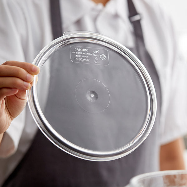 - Lock in your food's freshness with this Cambro RFSCWC2135 snap on cover! This cover is made to fit 2 and 4 qt. round, clear Camwear storage containers. The snap on cover seals tightly, yet can be easily removed. Made of virtually indestructible polycarbonate, this cover is durable and resistant to food stains. This cover works to keep foods and ingredients uncontaminated and organized for your convenience! With a temperature range of -40 degrees Fahrenheit to 160 degrees Fahrenheit this cover is perfect for use in refrigerators and freezers.