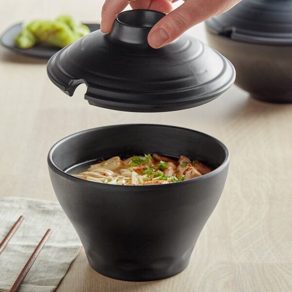 - Add a polished, sophisticated touch to your restaurant, buffet, or catered event with this GET B-400-BK Nara 32 oz. black matte round melamine bowl! Featuring a classic round shape, this bowl is perfect for serving your most popular soups and ramen. Plus, its bold, black color provides optimum contrast against colorful dishes, making them even more appealing. Its included lid also serves to keep contents safe and free from contaminants.
