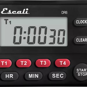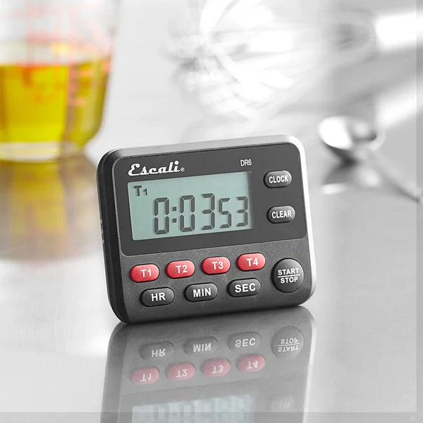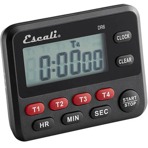 Ensure your signature dishes are cooked to perfection with this San Jamar Escali TMDGTE 4 channel digital kitchen timer with clock! With the ability to count down for up to 99 hours, 59 minutes, and 59 seconds, this timer is perfect for any restaurant, bakery, coffee shop, or pizzeria. Once it has finished counting, the timer alerts you that it's time to take food out of the oven. The alarm volume can even be adjusted to high, low, or mute depending on the volume level of your establishment! This timer is great for alerting you when dough is done proofing or when it's time to take your dessert creations out of the freezer.