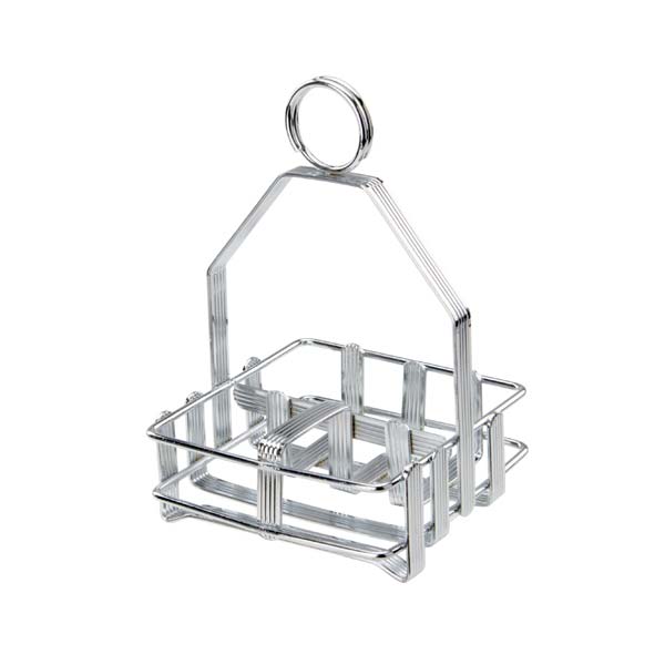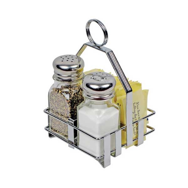 Created for holding 2 shakers and packaged condiments, this holder keeps your tabletop neat and arranged. For outstanding endurance, this shaker and packet holder is made from chrome-plated steel that