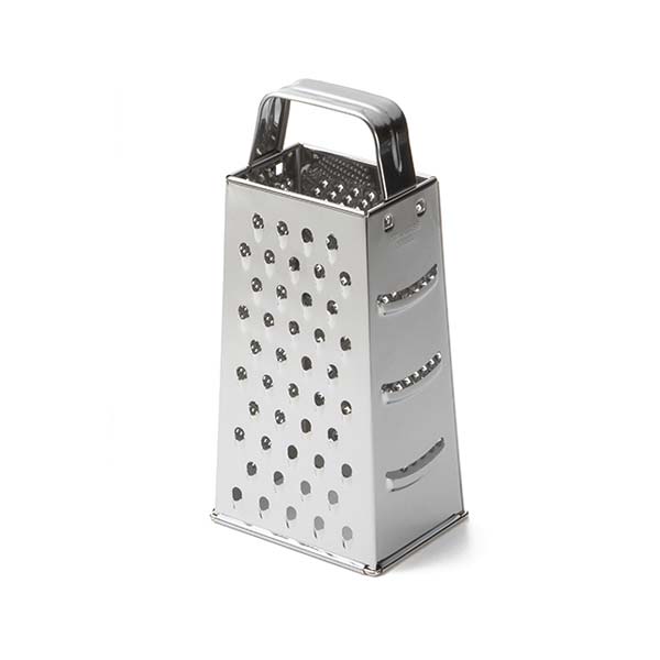 This Stainless Steel 4″ x 3″ Box Type Tapered Grater / Tablecraft is perfect for a wide variety of tasks, from shredding veggies to grating cheese. Each side features a different type of grater for versatility. It is designed for comfort and grip, and a non-slip base gives stability.
