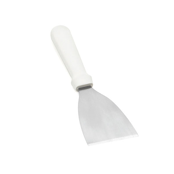 Expertly slide burgers, bacon, eggs, or buns off of your grill with this Stainless Steel 9-1/2″ Scraper with White Handle / Tablecraft. The sharp edge and ergonomic design enable you