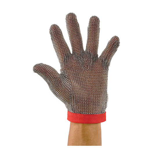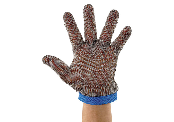 Made for meat processing, the rust-resistant 304L stainless steel rings that form these mesh gloves protect hands from cuts and punctures while deboning and butchering. Each glove is reversible and is fixed with a wrist strap that features a snap and cinch fastener to keep it secure.