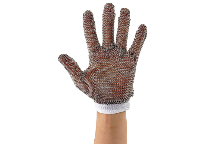 Made for meat processing, the rust-resistant 304L stainless steel rings that form these mesh gloves protect hands from cuts and punctures while deboning and butchering. Each glove is reversible and