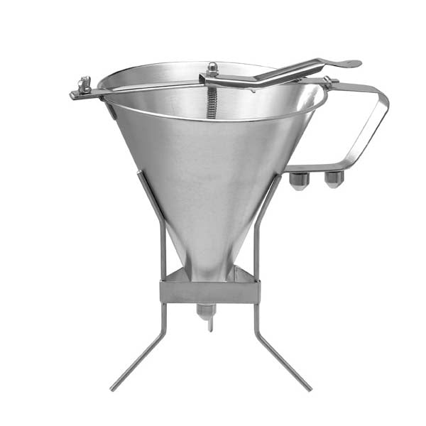 Made of stainless steel for durability and easy cleaning, this confectionery funnel has a simple operation that can be used with one hand. This funnel rack is meant to securely