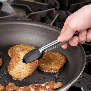 The Stainless Steel Silicone Grip Utility Tongs with Lock Clip by Winco are kitchen tongs with a silicone grip and a lock clip feature. They come in two sizes, 9 inches and 12 inches, and are made of durable stainless steel. The silicone grip provides a comfortable and secure grip, while the lock clip allows for easy storage and space-saving. These tongs are ideal for flipping, turning, and serving various types of food, including meats, vegetables, and pasta.