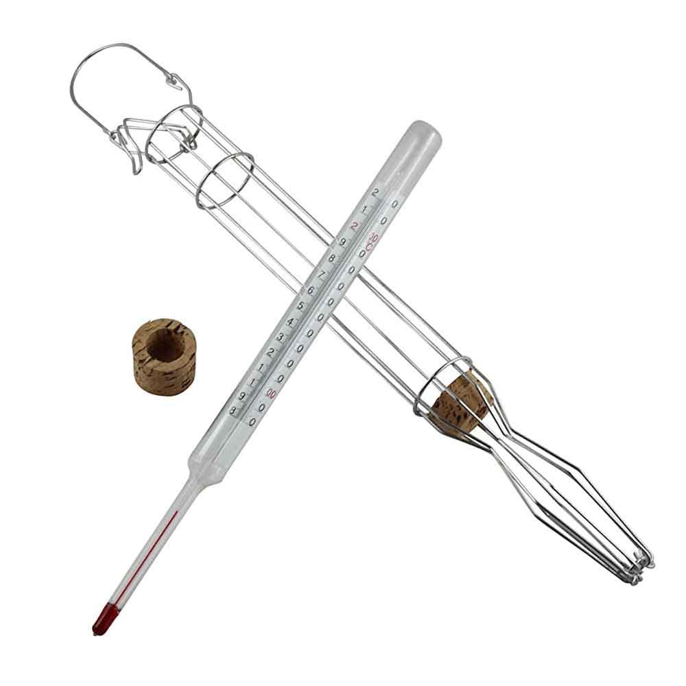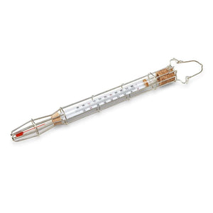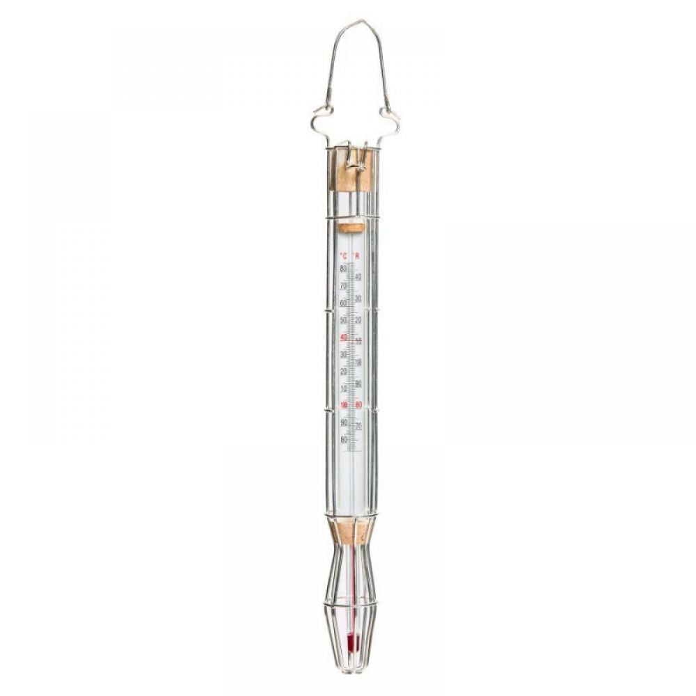 The glass sugar thermometer has a metal cage that protects it from accidental bumps and breakages and a convenient hook for storing and hanging.