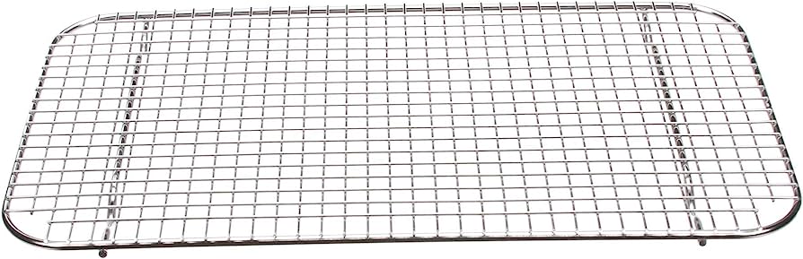 This full size heavy-duty cooling rack / pan grate is perfect for holding fries or bacon up and out of grease! This rack can be used as an easy way to hold a variety of cooked foods off of the pan surface. This ensures that you'll have less baked-on food material and an easier time cleaning the pan.Alternatively, you can use this item to cool baked goods. Its raised height makes it ideal for use as a cooling grate for baked products, or for holding food while icing, displaying, or drying.It features a footed design to give it a slight elevation off of your pan or countertop, for improved air circulation.Sized to fit in a full size steam table pan, this grate features ample finger room at corners for easy removal from the pan.