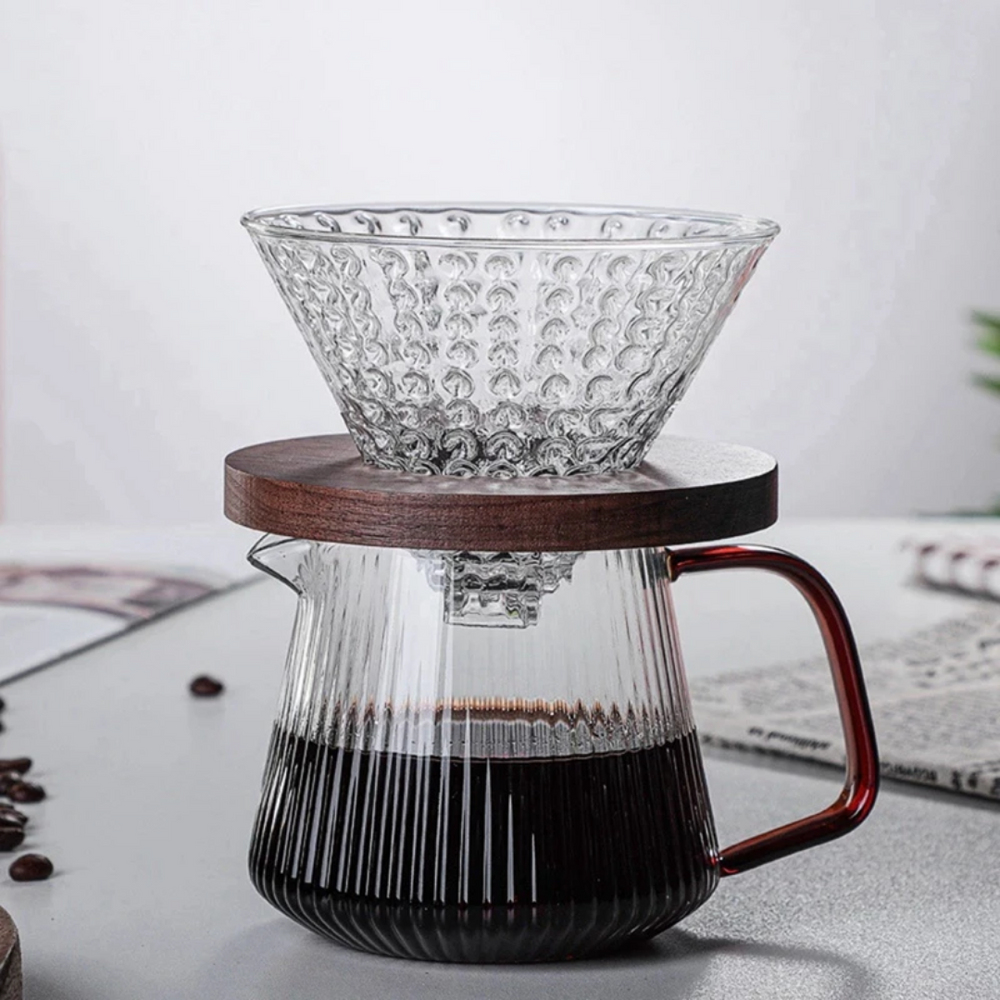 - The Pour Over Coffee Server with Vertical Stripes Glass comes in two sizes: 350ml and 500ml, and is available from Brewing Edge. This server is perfect for pour-over coffee brewing, allowing for precise control of water flow and temperature. The vertical stripes on the glass add a stylish touch to any coffee setup, while the durable glass construction ensures the server can withstand high temperatures. The server also features a comfortable handle and a spout for easy pouring. Whether you're a coffee enthusiast or a professional barista, the Pour Over Coffee Server from Brewing Edge is a great addition to any coffee brewing setup.