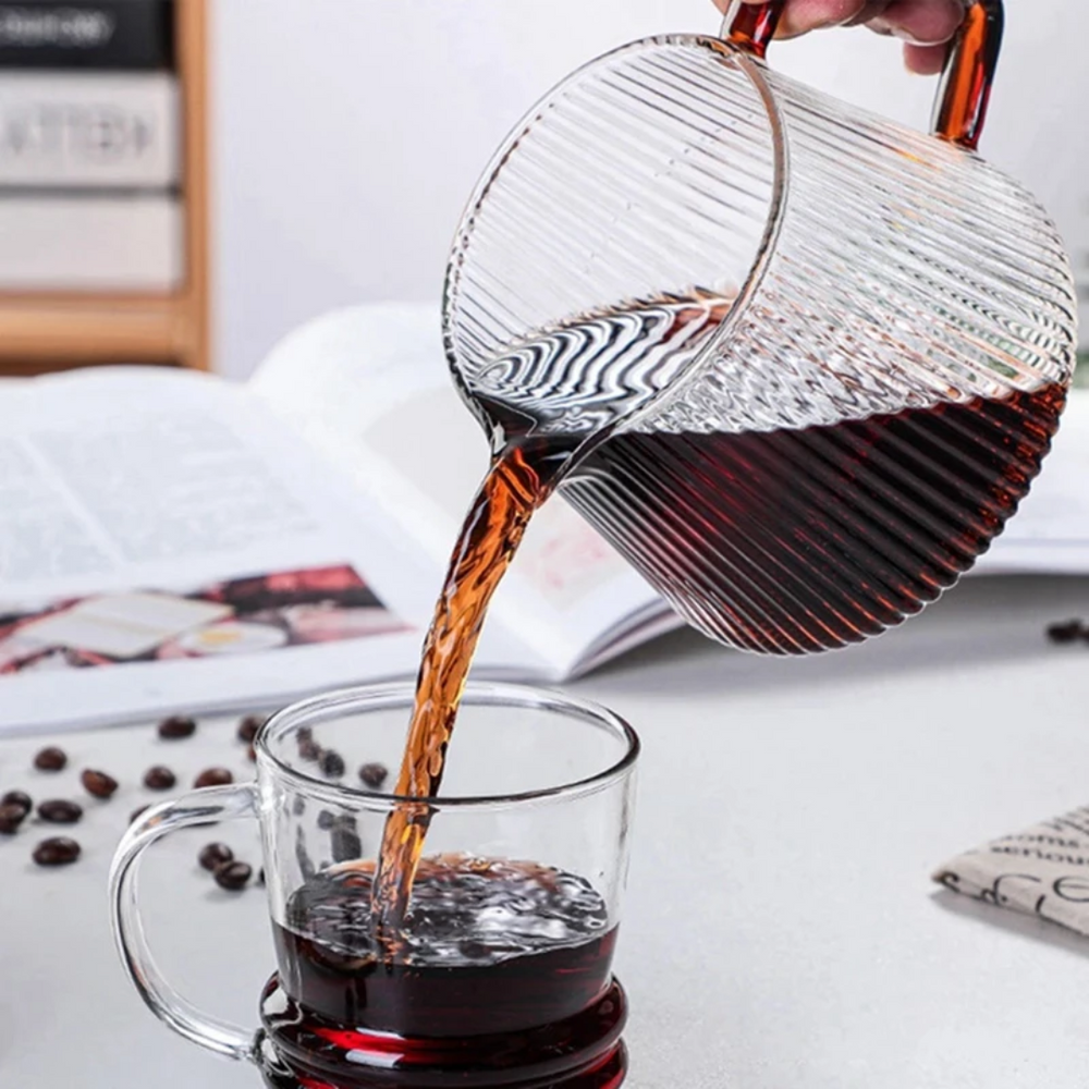 The Pour Over Coffee Server with Vertical Stripes Glass comes in two sizes: 350ml and 500ml, and is available from Brewing Edge. This server is perfect for pour-over coffee brewing,