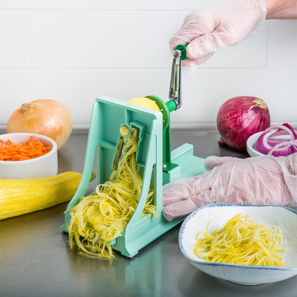 The Turning Slicer with Built-in Straight Blade is a kitchen tool used for creating long, spiral strands of vegetables like zucchini or carrots. This device is made by Winco, a company that specializes in producing a wide range of kitchenware, including slicers, cutters, and other tools.