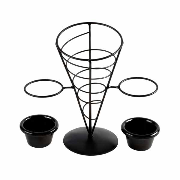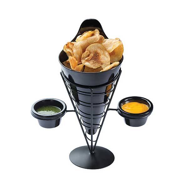 Add a contemporary touch to your food introduction with the Vertigo 9″ starter cone with ramekins. Serve everything from French fries, chicken strips, chips, and other “finger” foods with 2 various types of plunging sauce. This appetizer cone is constructed of black powder coated wire, and the 3 oz. black ramekins are constructed of solid melamine.