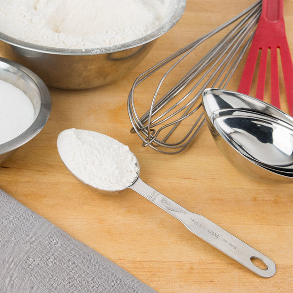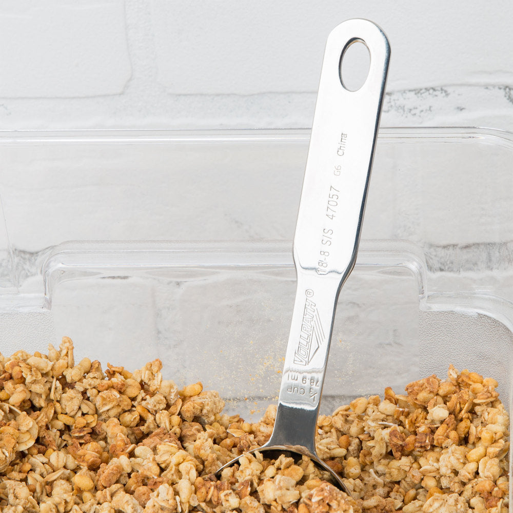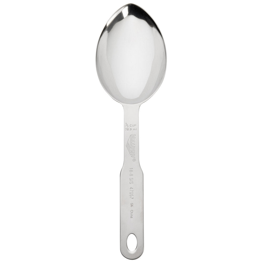 - Accurately measure your ingredients with this Vollrath 47057 1/3 cup stainless steel measuring scoop! Made of heavy-duty stainless steel, this measuring scoop is a durable addition to your kitchen. The one piece design makes it easy to clean while the loop on the end is perfect for hanging storage options. Thanks to the oval shape and long handle, this measuring scoop is great for hard to reach corners. The tapered bowl is ideal for batters and thick foods like gravy or creamy dressings, and it ensures easy pouring for added convenience. Plus, this scoop can also be used for dry ingredients like granola, chocolate chips, and coffee for exceptional versatility.