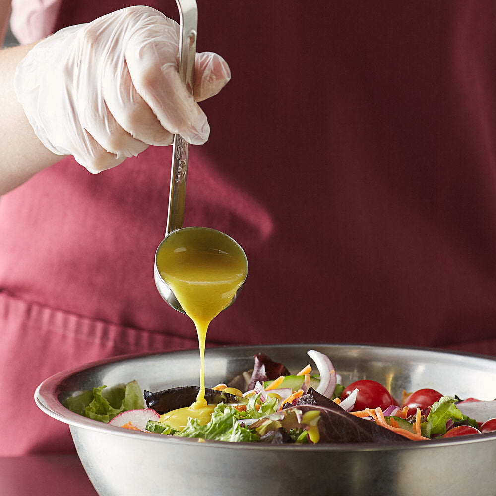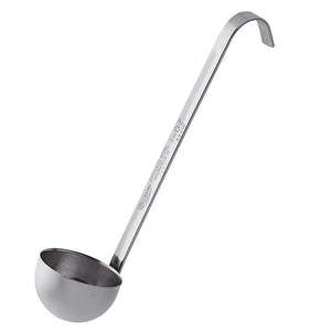 This ladle's two-piece design ensures it's a safe, sanitary component to your everyday kitchen service. Paired with a grooved handle, this two-piece construction also means it's more resistant to breaking, ensuring longevity and added strength. It also makes it easy to monitor portions, as its capacity is permanently marked right on the handle. So long as the ladle bowl is always full, consistent portions will always be served. Use this ladle to distribute a seasonal pumpkin spice salad dressing, a rich, cheesy sauce, or a spicy wasabi cream. It's as versatile as the dishes it's used to serve!