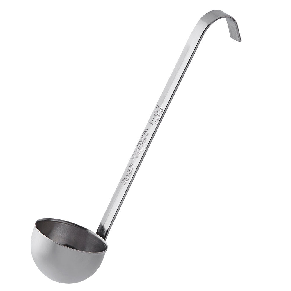 Featuring a durable 18-8 grade stainless steel construction, this Vollrath 58410 1 oz. two-piece stainless steel ladle with 6 7/8" handle makes it easy to serve your savory salad dressings, hearty side dishes, and award-winning sauces, time and time again! This durable stainless steel ladle will not bend or rust under normal use. A hooked handle allows the ladle to easily sit on the edge of pots without falling or slipping in, while also enabling easy storage at the end of service. At the same time, the stainless steel surface makes cleaning a breeze.