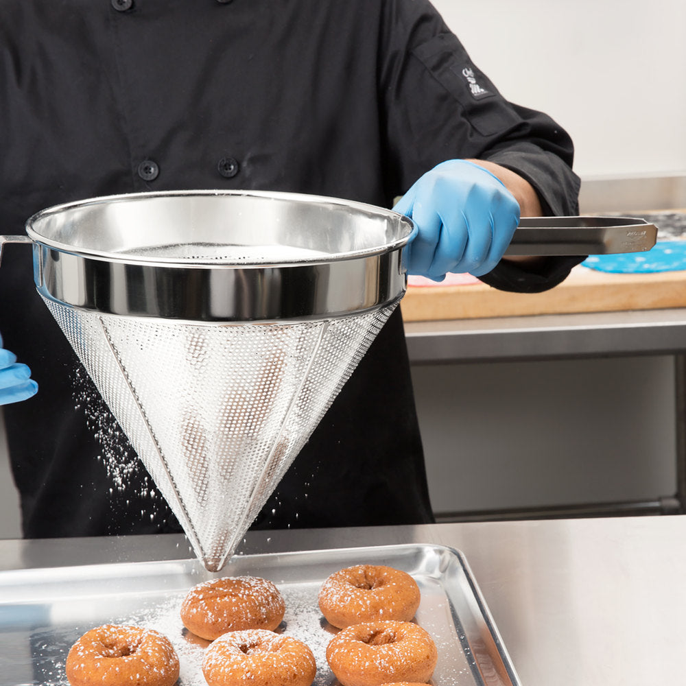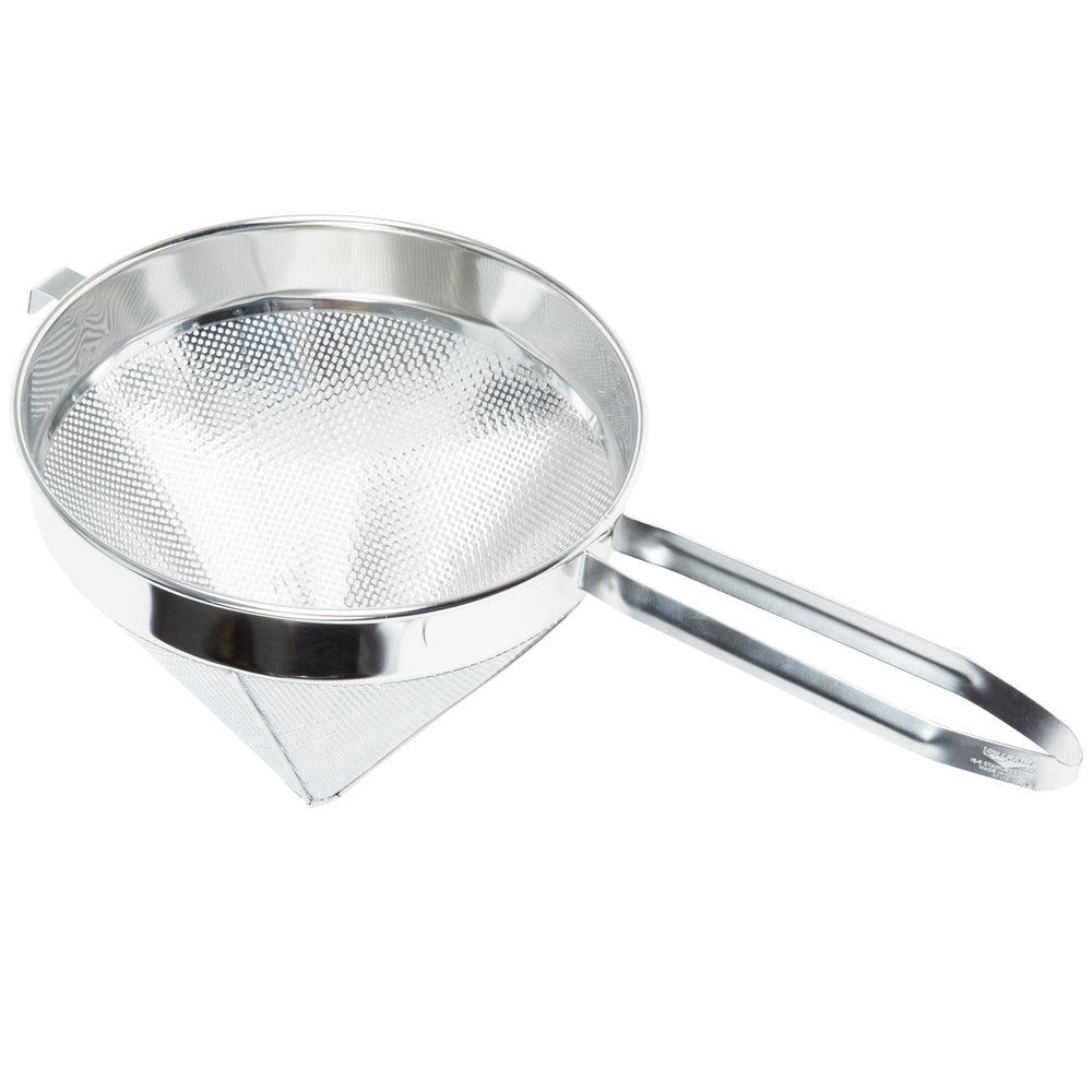 - This Vollrath 47178 12" coarse china cap strainer is the perfect tool for removing solid food particles from thick sauces and cooking liquids! It features a coarse mesh cone with 3/32" perforations that allow mixtures to strain through quicker than comparable fine strainers. Not only does its welded handle ensure a comfortable grip, it also allows for simple hanging to maximize your storage space while not in use.