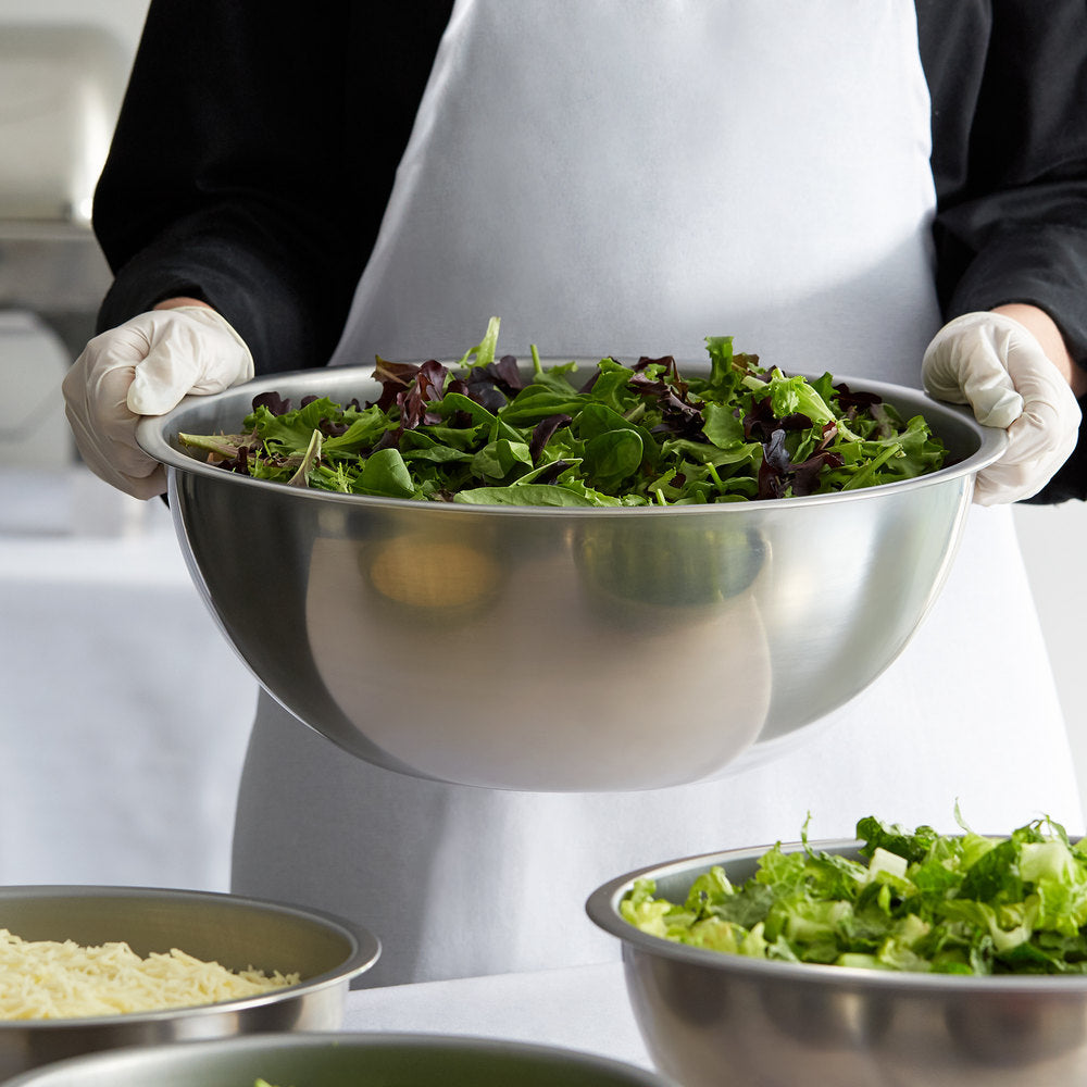 - Strong enough for any mixing job, this large, durable stainless steel mixing bowl is sure to become a staple in your commercial food prep area. It's perfect for preparing a variety of bulk foods, from salads to sauces! It features a weighted, concave bottom to ensure that the bowl stays stable when in use. Wash and reuse it time and again without the worry of warping or denting.