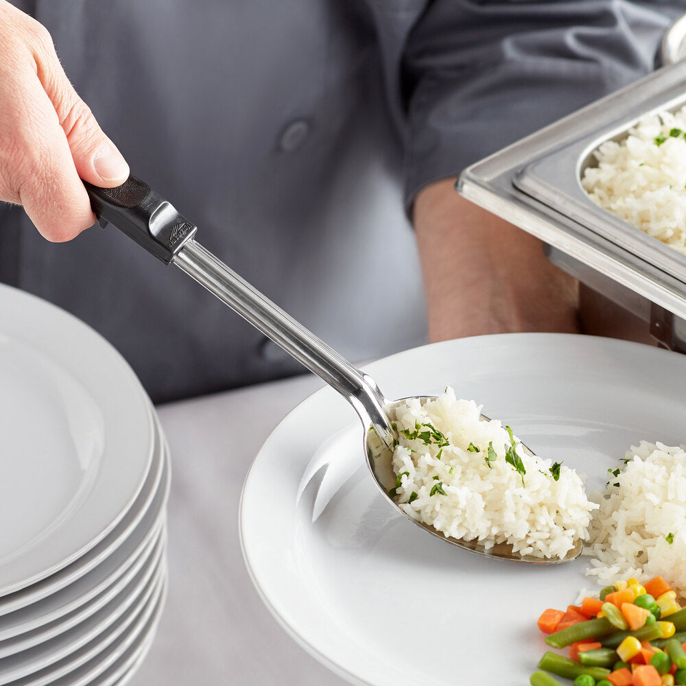 - Serve your signature dishes in style with this Vollrath 46945 14" stainless steel solid basting spoon with black Grip 'N Serv® handle. Made with a durable stainless steel construction, this spoon is built to last in your busy establishment and is perfect for basting, skimming fat, and collecting drippings. Its long handle resists heat up to 230 degrees Fahrenheit, which makes it perfect for serving high-heat foods. It also boasts also a thumb notch that ensures a comfortable grip and prevents the spoon from slipping into pots when in use. The hanging hole at the end of the handle also allows for convenient storage.