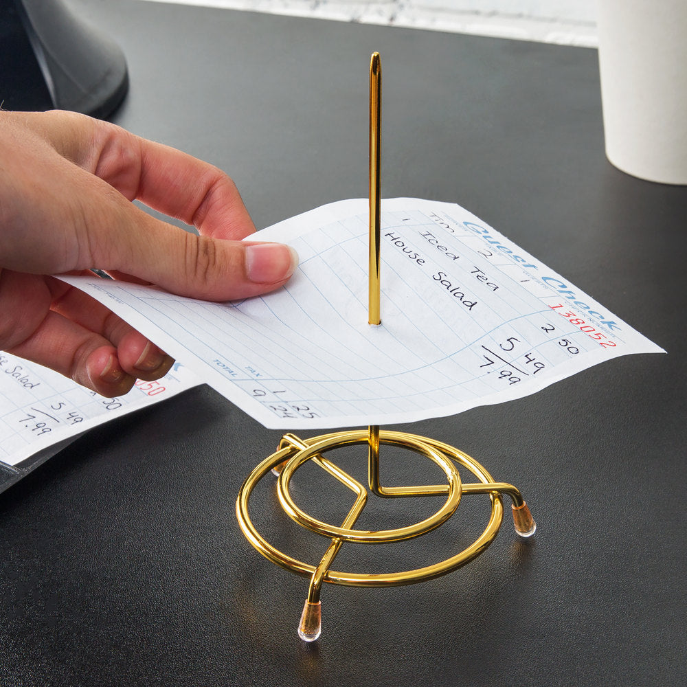 This check minder features a simple, brass plated construction for an upscale appearance suitable for front of house use. The sturdy design of this spindle is great for busy establishments and ensures checks will not go missing upon mealtime rushes and rotations of employees. The rubber feet keep this spindle in place and prevent it from scratching surfaces. This spindle also includes a rubber cap that can be placed atop the top point to secure checks even more. An attractive and easy-to-use solution for check management, this check minder / spindle is great for restaurants, diners, food trucks, and other foodservice establishments.