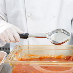 - Control portions and maximize profits with this Vollrath Jacob's Pride 6412420 4 oz. black solid oval Spoodle®! Perfect for creating consistent serving sizes and dishing up just the right amount of dips, dressings, sauces, gravies, and more, this kitchen staple combines the convenience of a serving spoon and the accuracy and consistency of a ladle. Practically designed, this Spoodle® features a built-in stopper notch to prevent the handle from sliding into food pans, and a textured, ergonomic handle to reduce hand fatigue. The oval scoop is designed to reach food pan corners, ultimately reducing waste and increasing the number of servings per pan!