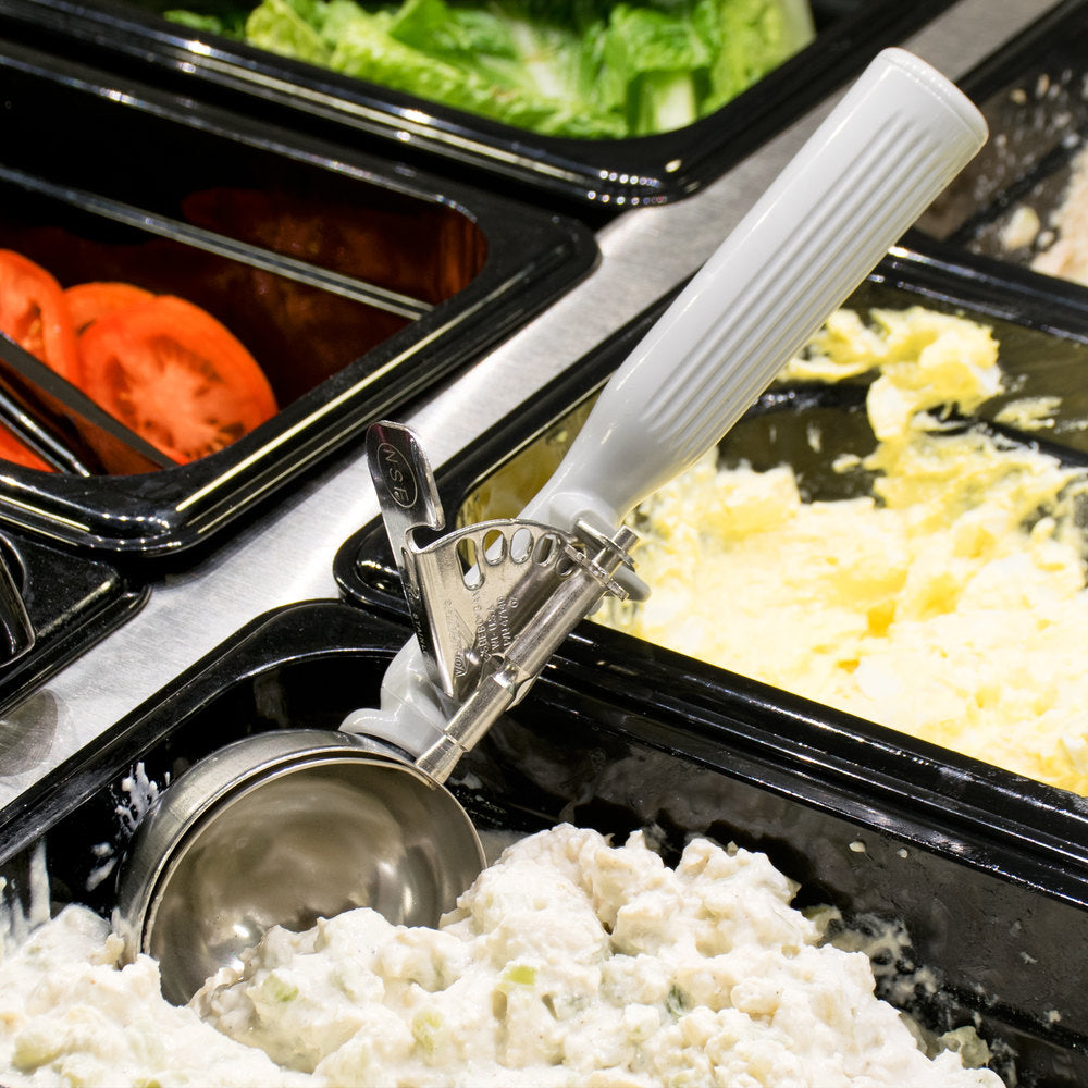 The 18-8 stainless steel bowl and components prevent corrosion for added longevity in a high volume environment. An extended, grooved handle provides a secure grip for comfortable, all-day use, and the one-piece construction makes cleaning easy and improves durability. This seamless design prevents the build-up of food and bacteria residue in cracks and crevices to save you the time and effort of hand scrubbing and scouring your disher.
