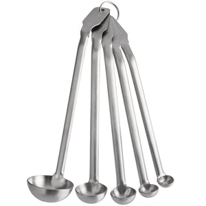 This set includes five different ladles so that you can portion and serve a variety of foods with precision. Capacities are clearly stamped on the handles, in both ounces and milliliters, for easy identification. The flared design of the handle also prevents the ladles from slipping into insets and pots during use. There is also a hole at the top of the handle and a ring connecting them for convenience and easy storage. Use these ladles to drizzle melted cheese or chocolate, or perfect your dishes by topping them with gravy and other sauces. Whether you're creating entrees or desserts, these measuring spoon ladles bring convenience to any restaurant, salad bar, bakery, or cafe.