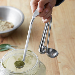- Measure and serve precise portions with this Vollrath 44572 stainless steel measuring spoon ladle set. Consistency is a key component in any professional kitchen, no matter how small the task. This measuring spoon ladle set allows you to precisely measure and dish out different sauces, spices, and toppings every time. The short, 6" handles fit easily into tight areas, and the bowl shape is ideal for squeezing into small openings. With stainless steel construction, these ladles resist corrosion and rusting while being able to withstand high temperatures. They are a durable, enduring addition to your kitchen.