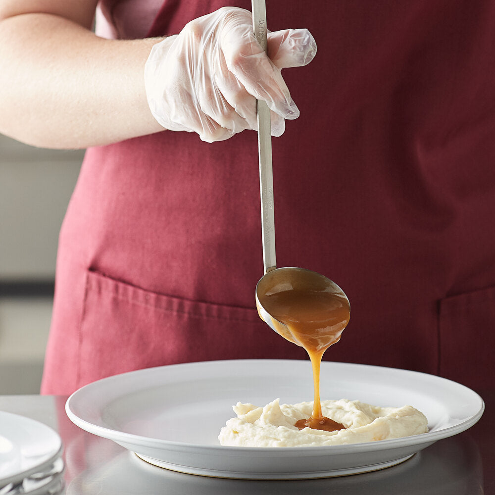 The heavy-duty, 430 grade stainless steel handle and bowl are resistant to both corrosion and rusting, while the classic, two-piece construction allows for sanitary use and is easy to clean. This ladle has its capacity clearly marked on the handle for consistency and accuracy. For added convenience, a hooked handle helps the ladle to sit on the edge of the pot, which prevents it from sliding into your foods and also creates easy storage. No matter the intended use, this ladle is up to the challenge!