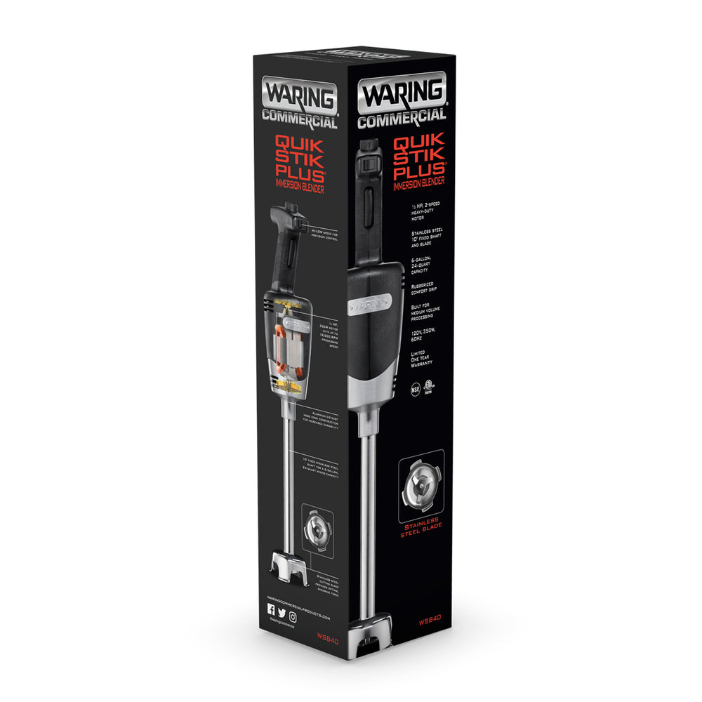 - Easily purée, whip and emulsify anything with the 10" Waring® WSB40 Quik Stik Plus®. This medium-duty immersion blender has high and low speeds along with a rubberized comfort grip for safe and controlled operation. Its all-purpose, stainless steel blade and shaft is easy to clean and lightweight, while its 1/2 HP heavy-duty motor revs up to 18,000 RPM.