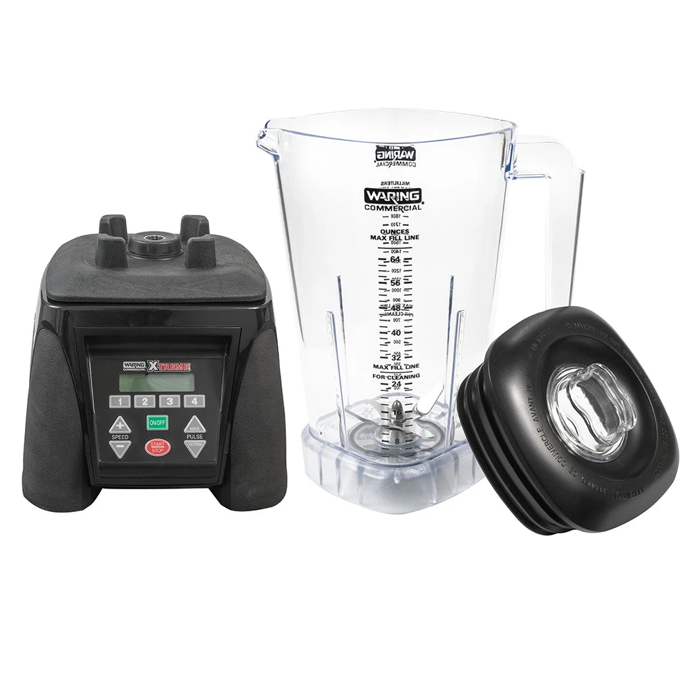 Because of its strong motor, the Waring MX1500XTX Xtreme high-power blender can create bar drinks, smoothies, salsas, and desserts. Its 64-ounce Raptor™ jar has graduation measurements for accuracy and is made of clear, break-resistant copolyester. For quiet operation, a jar pad and polycarbonate sound enclosure lower noise production, but if the sound level is not an issue, the enclosure can be removed, offering fast access through the lid for adding ingredients.