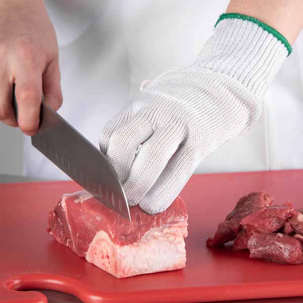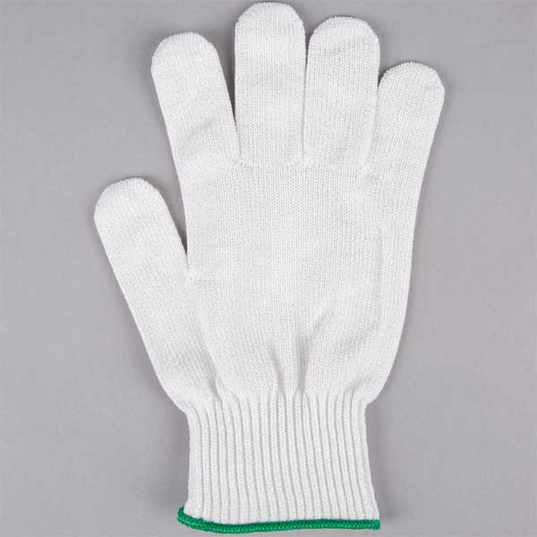 Designed to reduce the occurrence of injuries, this White Medium The Protector Glove with Green Cuff will instantly increase the safety and speed of your commercial kitchen’s operations. Designed specifically for kitchen use, all materials are FDA-approved for direct food contact. For your convenience, this glove is machine washable and bleach safe – simply toss it into your washer or laundry bin at the end of a busy day. It is perfect for commercial kitchens, sandwich shops, delis, and butcher shops.