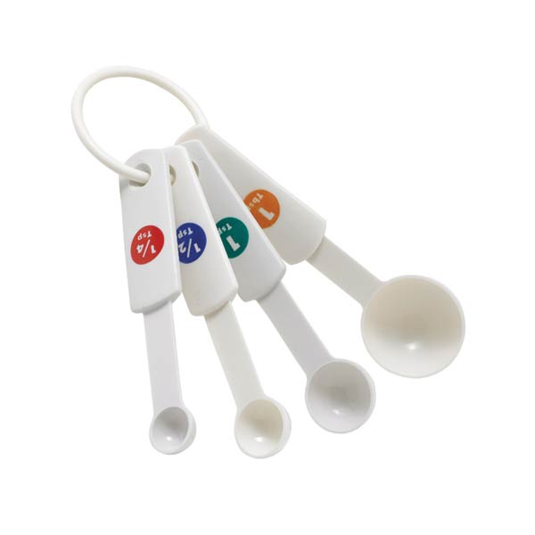 An essential addition to any bakery or other food service facility, the White Plastic 4 Piece Measuring Spoon Set With Capacity Marking from Winco is excellent for measuring accurate portions of ingredients for your specialty dishes. Created from sturdy plastic, this measuring spoon set will serve your business for years. Provided with 1/4 tsp., 1/2 tsp., 1 tsp. and 1 tbsp. capacity spoons, this set will accommodate the basic measuring tools you will need for creating mouthwatering desserts.